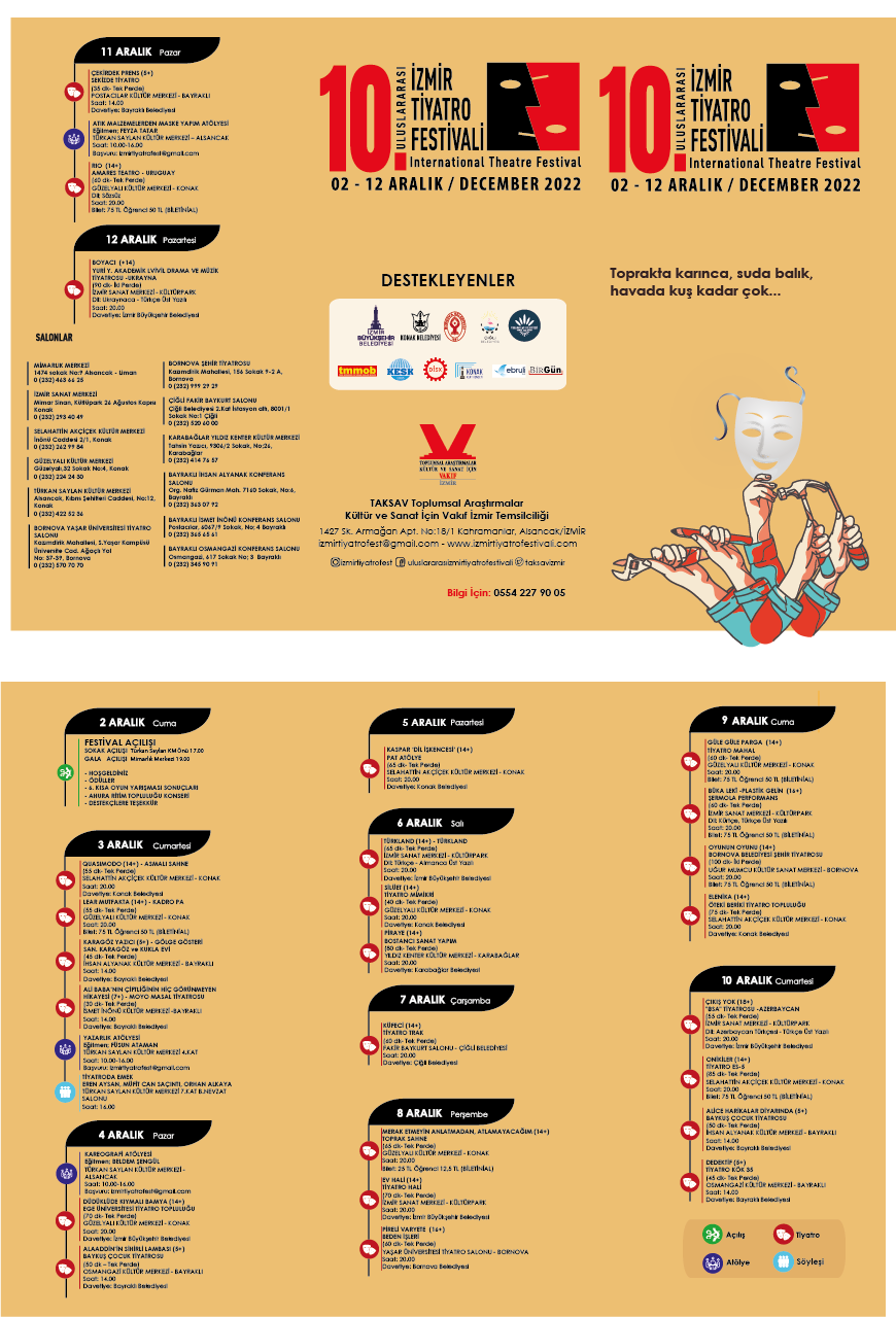 10.Uluslararası İzmirTiyatro Festivali, Boyacı oyunuyla sona erdi. Ukraynanın hayat verdiği Boyacı oyunu seyircinin büyük ilgisini çekti. Oyun sonrası, bütün Taksav sahnede seyirciyi selamladı ve seneye kadar perdeleri kapattı.